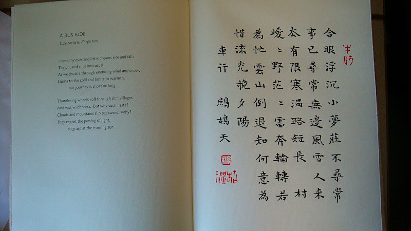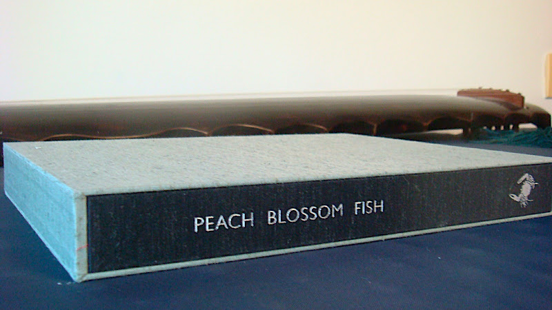 这次,白谦慎给我带来的一部《桃花鱼》也是充和先生知道我喜欢分给我高兴的。她信上说,「此书小诗词共只十八首,纸张及装饰重量倒有二三磅」,邮寄麻烦,只好趁白先生过港之便带过来。读书的人我想都会喜爱这部书:张充和漂亮的小楷抄录自己的作品,丈夫HansH.Frankel英译,逐页对照,全部精印在安格尔米白厚纸之上,阿拉斯加雪杉木材做封面,印刷装潢工序一概由I an Boyden 的Crab Quill Press手工完成,书尾题署Colophon还详细说明全书用料,限印一百四十部,我这部是第三十三部。
